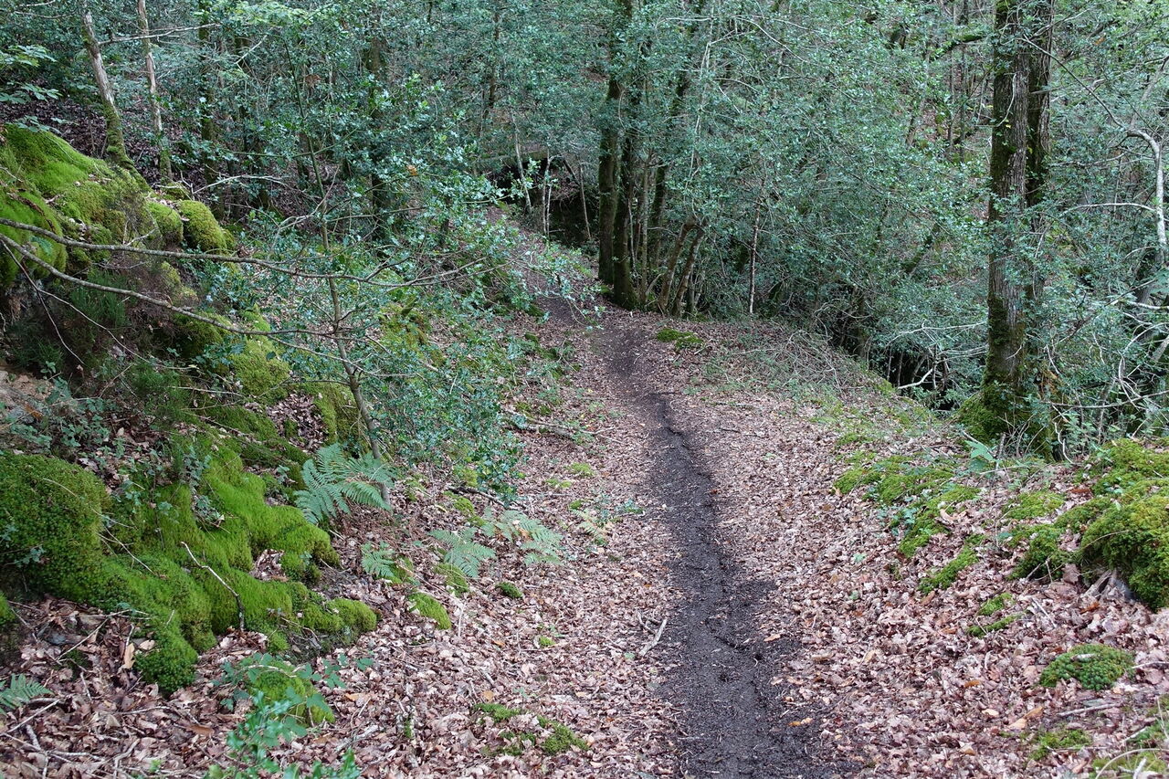 Wir durchqueren eine Streusiedlung und überqueren zwei aufeinanderfolgende asphaltierte Straßen. Nachdem wir eine weitere Straße gequert haben, gehen wir noch bis zum Ende der Piste vor, dann links bergab und an dem 20-km/h-Schild vorbei. Hinter einem urwaldähnlichen Wegabschnitt erreichen wir den Fluss 02 Aulne Maritime (3 m). Schauen wir nach rechts, so sehen wir in der Ferne eine Hängebrücke. Wir gehen 50 m zurück, um an der Stelle, wo von links ein Wanderweg kommt, rechts durch das Holzgatter zu gehen und dann halb rechts auf der Fahrspur weiterzuwandern. Hinter einem Holzhaus gehen wir halb rechts auf einem Pfad weiter, der etwas erhöht über dem Flussbett verläuft.