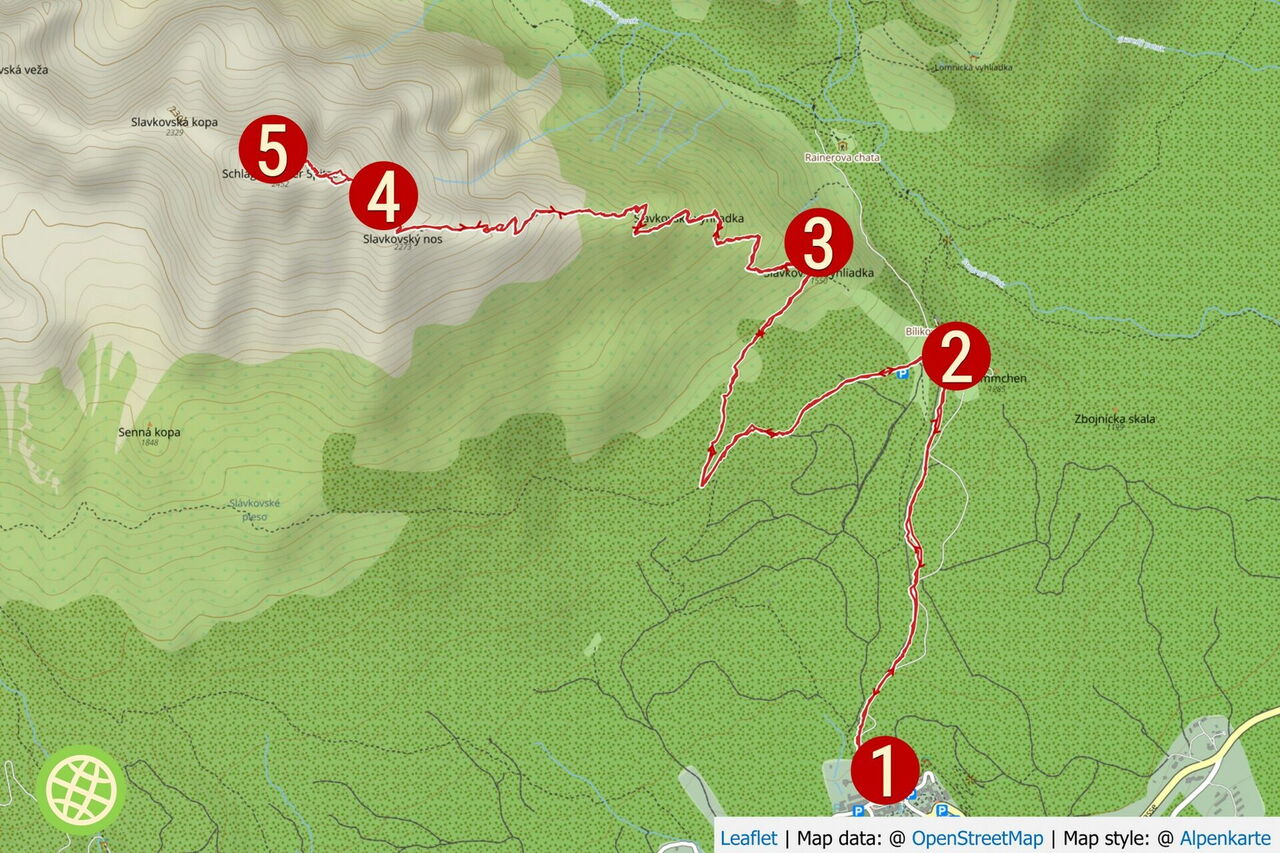 An der Bergstation 02 Hrebienok (1258 m) der Standseilbahn gehen wir in westlicher Richtung an dem Restaurant und dem 4-stöckigen Turm vorbei, um dann auf Höhe eines Hauses auf den halb rechts abzweigenden Pfad zu gelangen, den roten Wanderweg der Tatranská Magistrála. Ohne signifikant an Höhe zu gewinnen – es geht sogar ein kleines Stück bergab –, quert der Pfad zunächst die südlichen Hänge des Slavkovský štít. Bei der nachfolgenden Weggabelung, mit zahlreichen Wegmarkierungen gehen wir scharf rechts. Etwas ernüchternd sind die ausgeschilderten 4 Stunden und 15 Minuten Anstieg bis zum Gipfel – ist es wirklich so lang?