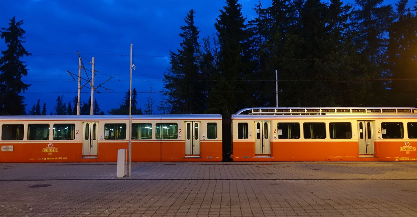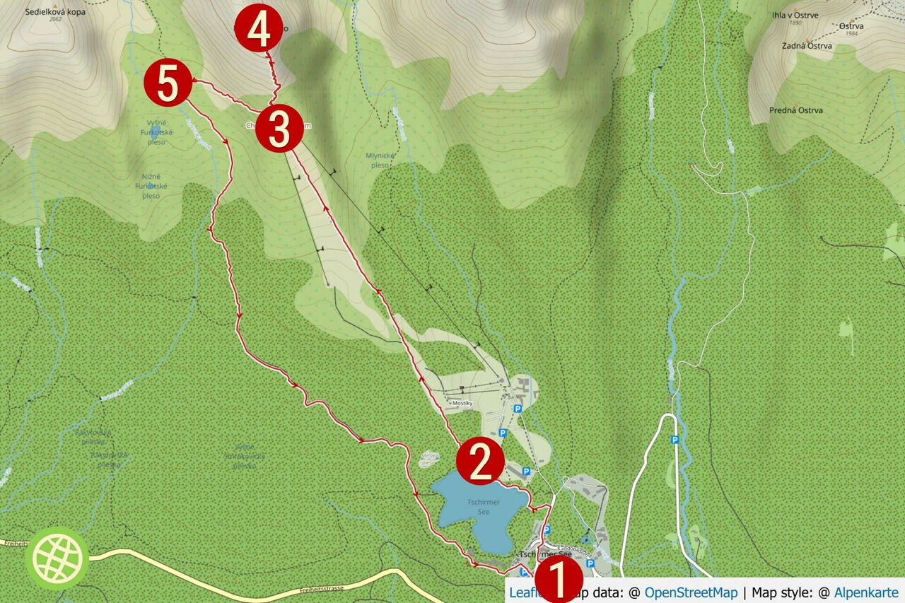 Den Bahnhofsplatz der elektrischen Schmalspurbahn 01 TEŽ Štrbské Pleso (1322 m) verlassen wir in nördliche Richtung und gehen an dem rechts von uns liegenden großen Parkplatz vorbei in Richtung des großen Funkturms. Sobald die Straße endet, marschieren wir links und sofort wieder rechts, nun durch die Fußgängerzone des Ortes. Nach kurzem Aufstieg gehen wir an der Straßenkreuzung weiter in nördliche Richtung entlang der Straße, vorbei an einem weiteren Parkplatz. Nach 100 m verlassen wir die Straße – noch vor der Brücke – nach links zum ausgeschilderten Spezialitätenrestaurant Koliba Patria.