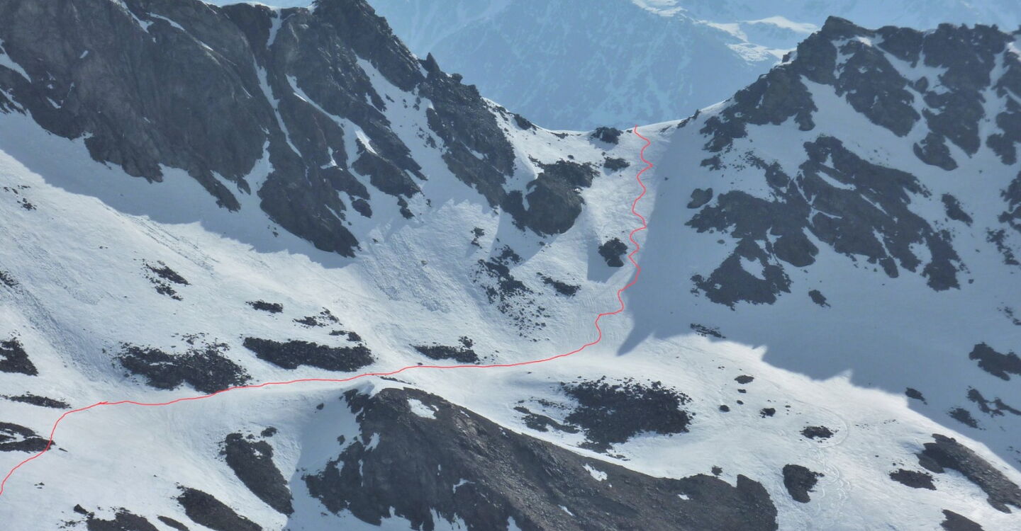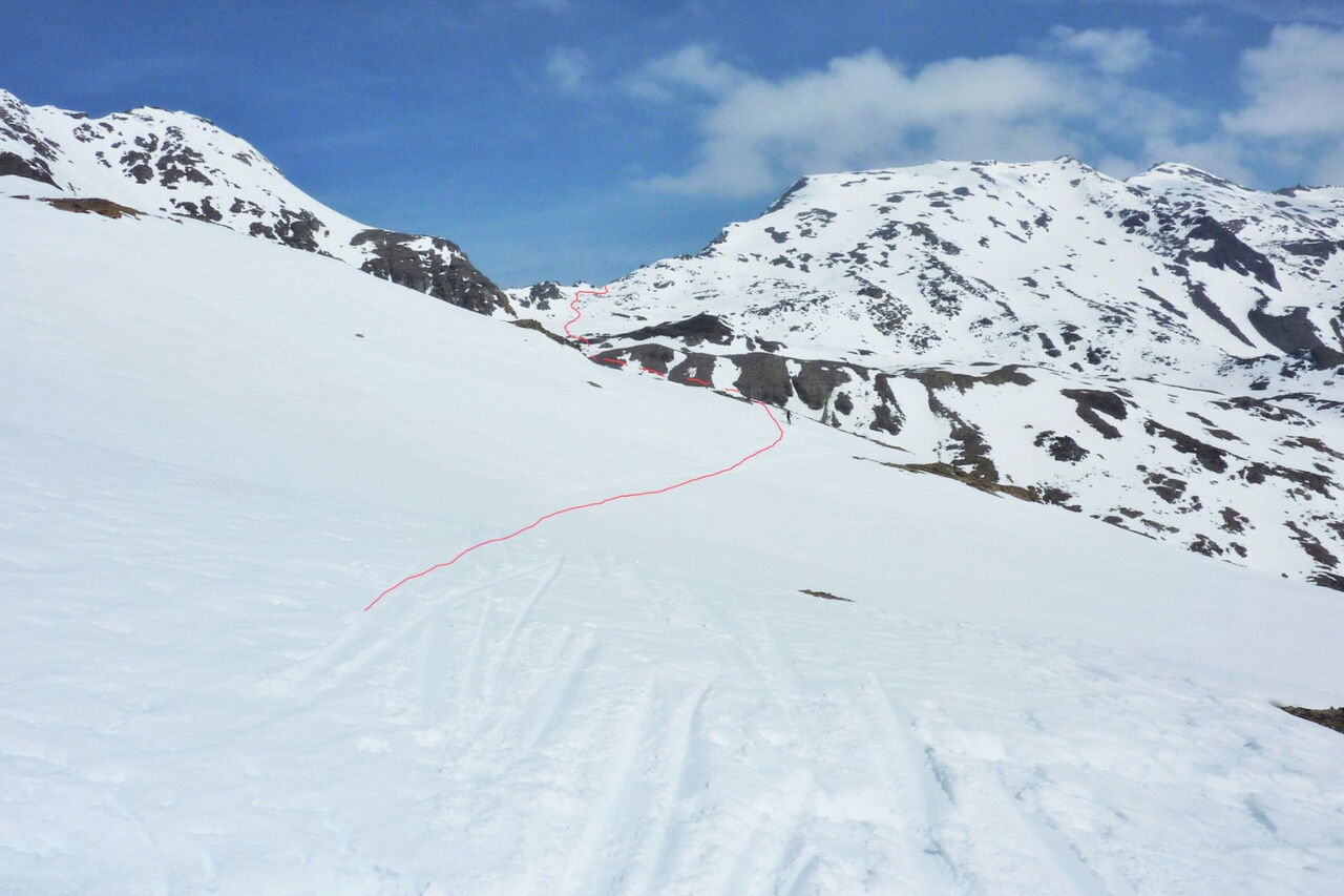 Genau im Gegenhang, Richtung Osten, liegt ein kleiner Pass, den wir überwinden müssen, um ins Pedertal zu gelangen. Dazu queren wir den Hang bis ca. 1,5 km bis zum Anstieg.
