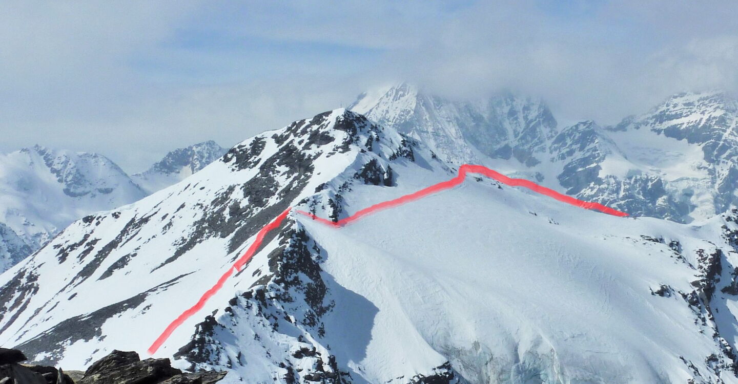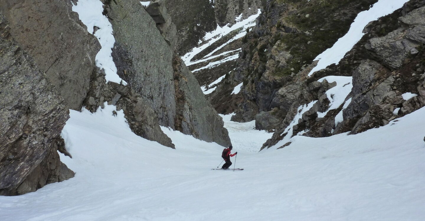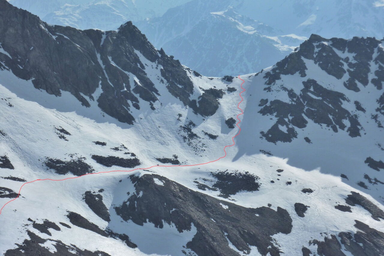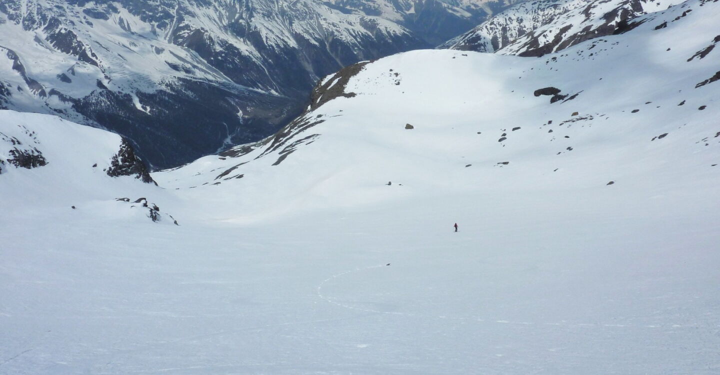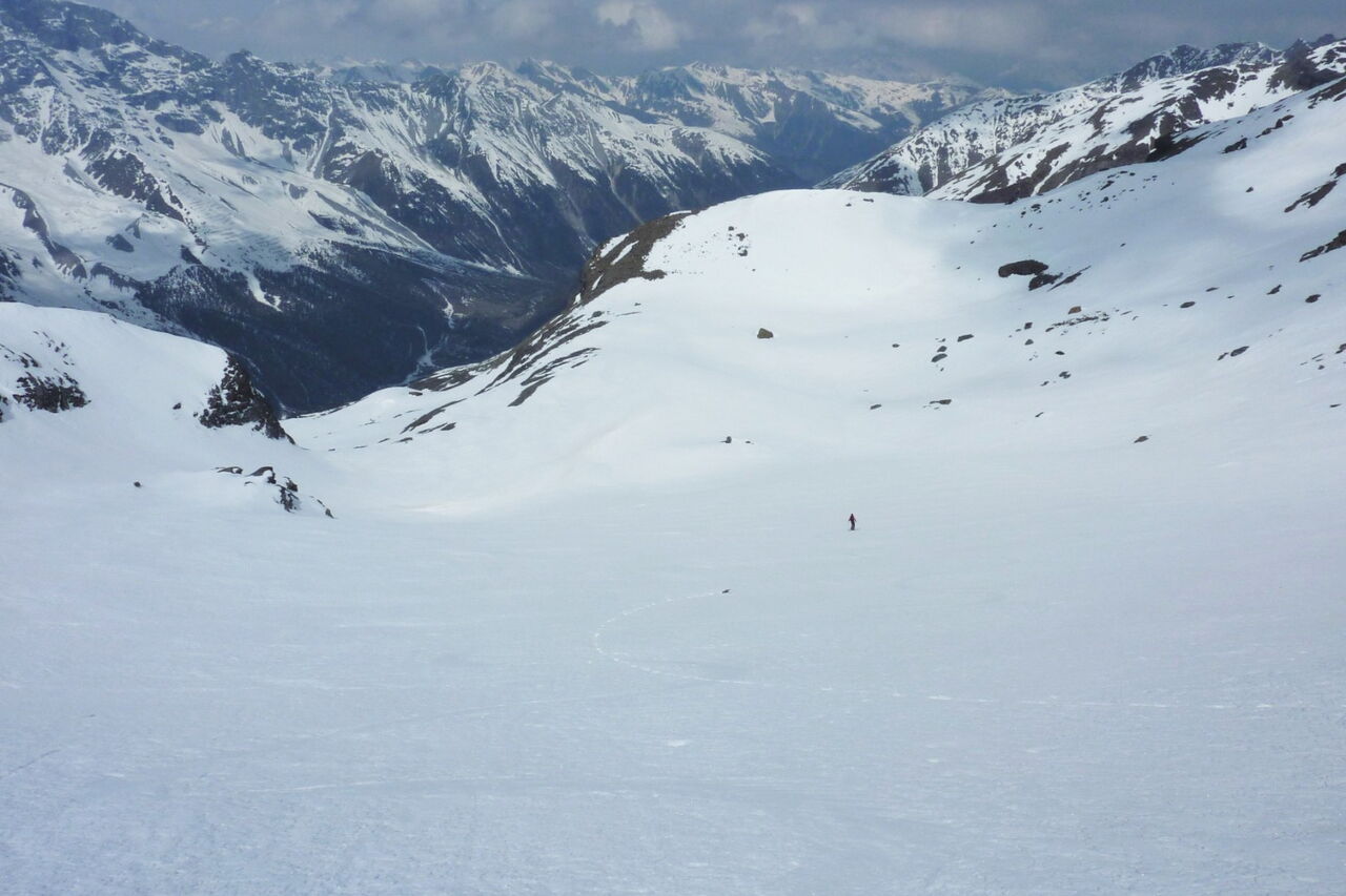 Unter uns liegt der Pederferner, und die Abfahrt kann beginnen. Je nach Route fahren wir noch durch einige schöne Scharten, bis wir ins Rosimtal und dann auch schon bald nach Sulden kommen.