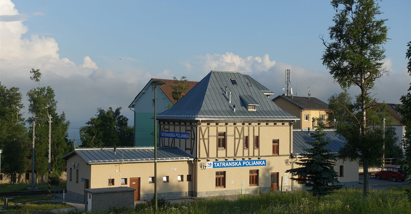 An der darauffolgenden Wegeverzweigung gehen wir geradeaus weiter. Bei einer Brücke, die rechts über den Bachlauf führt, verlassen wir den Hauptweg. Kurz später wechseln wir ein weiteres Mal zur anderen Bachseite hinüber. Wir überqueren die asphaltierte Straße und setzen unseren Abstieg hinter dem überdachten Picknickplatz fort. Mehrmals queren wir die Zufahrtsstraße zum Sliezsky dom. Bei einem Parkplatz gehen wir dann bis zur Hauptstraße herunter, queren diese und erreichen nach wenigen Metern bergab den Bahnhof 05 TEŽ Tatranská Polianka (941 m).