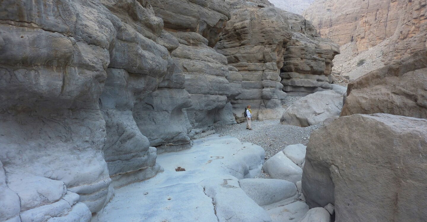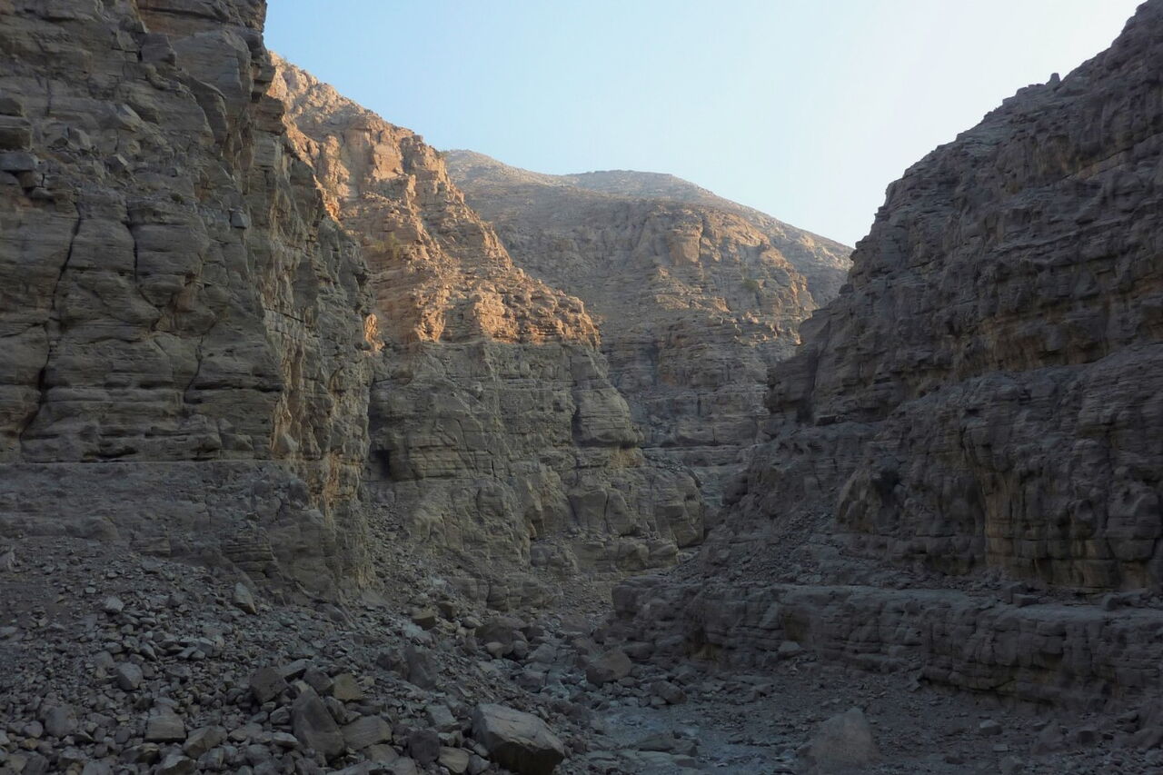 Wir gehen auf einem Pfad ins Wadi Qadah hinein. Die Wände der umliegenden Berge fallen hier bis zu 400 hm senkrecht ab, und der Pfad ist gesäumt mit riesigen Steinblöcken.
