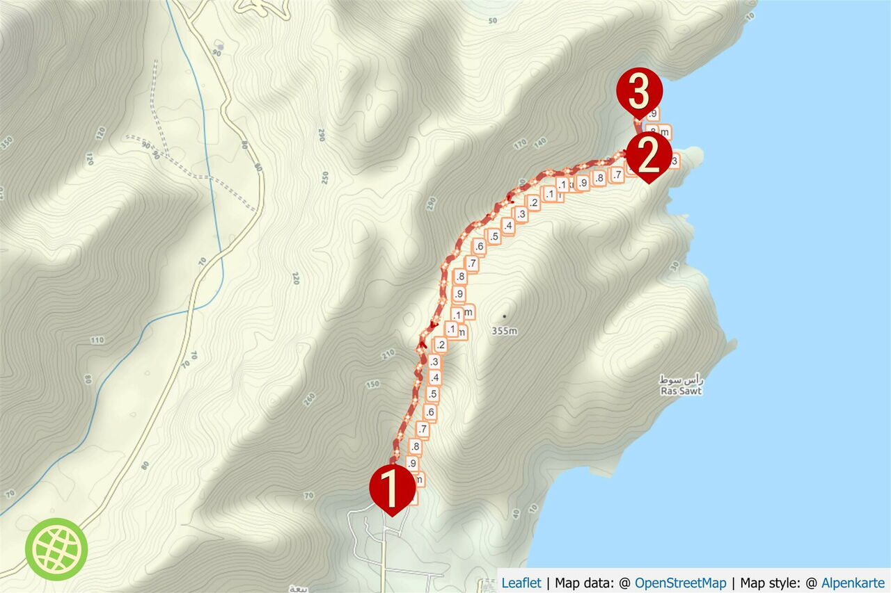 Die Garmin-Navigationsgeräte erlauben die Eingabe der GPS-Koordinaten N25 40.504 E56 15.910. Sie führen dich zum Startpunkt, von wo du den heruntergeladenen GPS-Track verwendest.