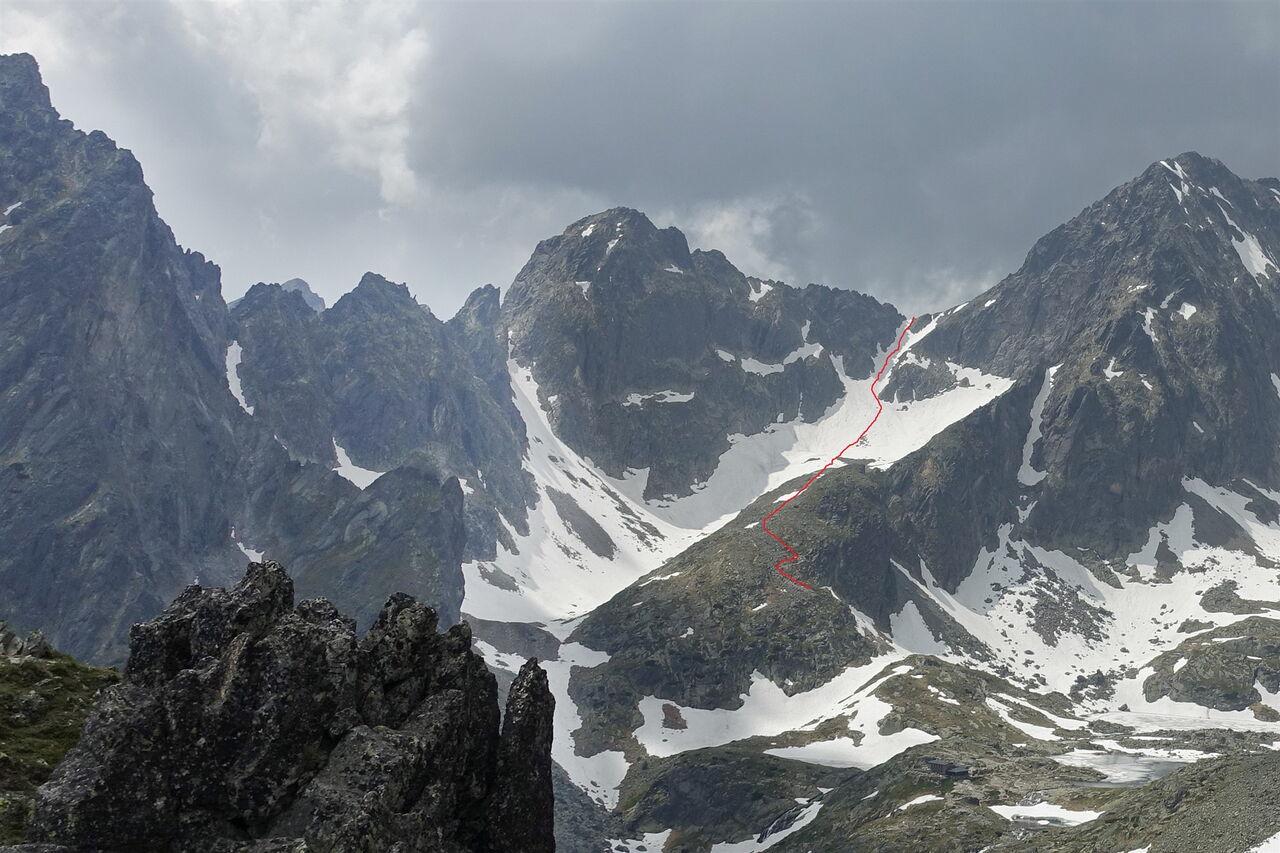 Wir müssen durch eine extrem steile Scharte aufsteigen. Bei Schnee sind Steigeisen und ein Eispickel obligatorisch. In schneefreien Zeiten geht man an Sicherungsketten und auf einem mit Holzbohlen gesicherten Pfad. Wir überqueren den Sattel 03 Sedielko (2376 m).