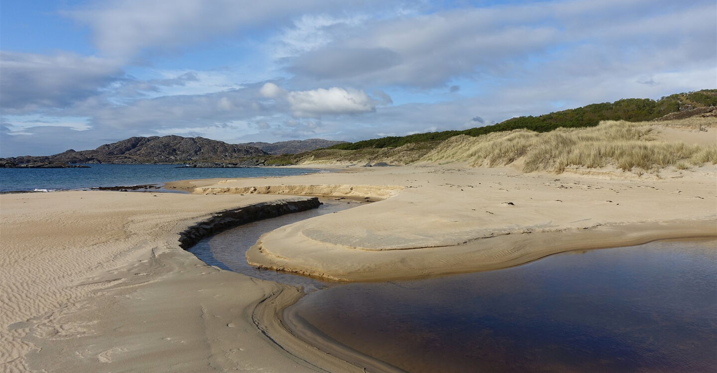 Die Kentra Bay auf der Halbinsel Ardnamurchan ist geprägt von Salzwiesen, versteckt liegenden goldgelben Sandstränden und eindrucksvollen Sanddünen. Der Wanderweg führt durch eine Waldplantage zum schönsten aller Strände auf dieser Runde, ein magischer Kraftort und mit einer atemberaubenden Aussicht auf die kleinen vorgelagerten Inseln. Es gibt die Möglichkeit, Wattvögel zu beobachten, und mit etwas Glück kann man Seeadler, Seidenreiher, Robben oder Otter entdecken.