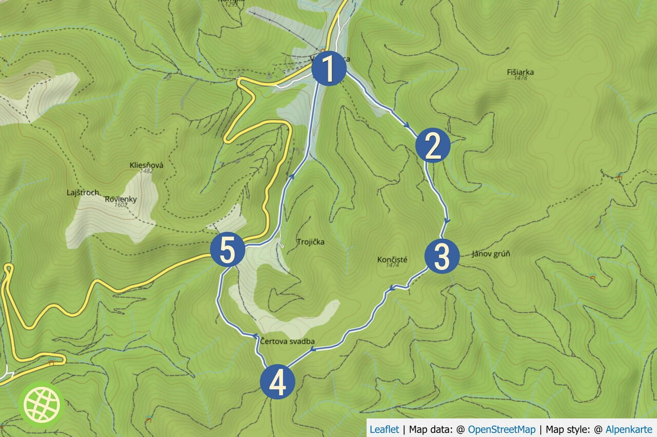 Gemächlich geht es auf der Forststraße bergab bis zum Pass 05 Čertovica (1232 m). Noch vor der Passstraße mit den Häusern führt rechts eine schmale asphaltierte Straße bergab. An dieser Stelle befindet sich auch ein Wegweiser Richtung Chata pod Čertovicou (100 m). Nach kurzem Abstieg erreichen wir eine Stichstraße, die zur Unterkunft und dem dazugehörigen Restaurant führt. Lässt man die Stichstraße aus, so kommt man auf dem Weg ins Tal an weiteren historischen Bauernhäusern vorbei. An der Ortsdurchgangsstraße von Vyšná Boca gelangt man rechts bis zum Ausgangspunkt.