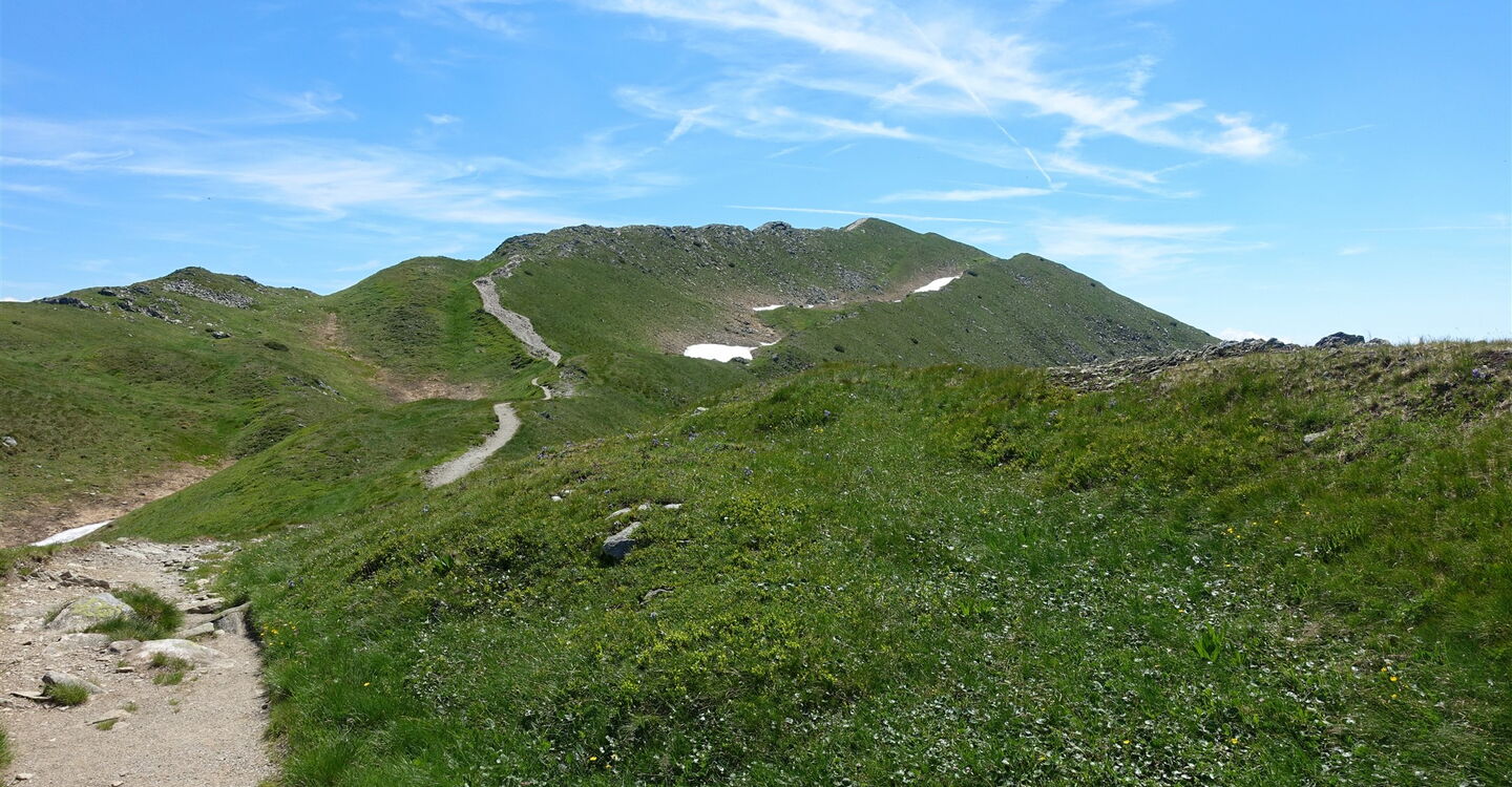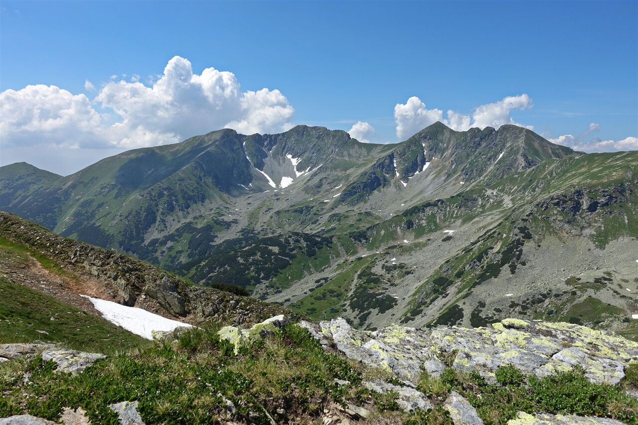 Ein breiter ausgetretener Pfad ist weithin sichtbar. Wir erreichen den Berg 03 Smrek (2072 m), bei guter Fernsicht schaut man auf die nordwestlich gelegenen Bergspitzen Prislop, Banikov, Hruba kopa und Trio kopy. Über diese führt der Klettersteig, wie in Wanderung 31 beschrieben.